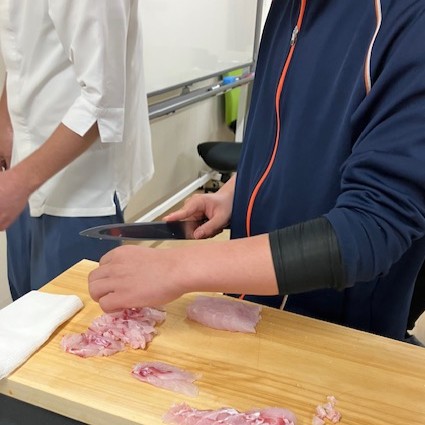 料理が大好きなB君は、西村さんから包丁を貸してもらって魚の切り方を教わり、さらにお寿司のにぎり方も教えてもらいました。「あんなに長くて切れる包丁、すごいね!」と終わってからも興奮冷めやらぬ様子でした。