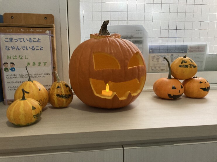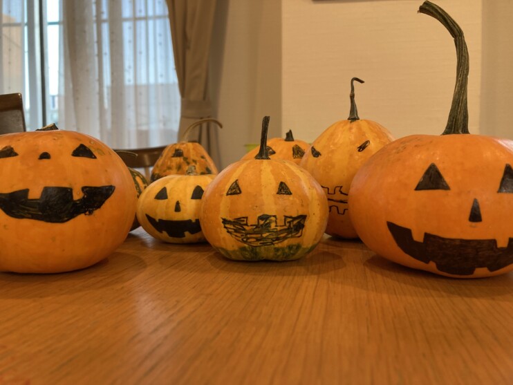 大きなかぼちゃをくり抜いたものと、小さなかぼちゃにお顔を描いて飾りました。