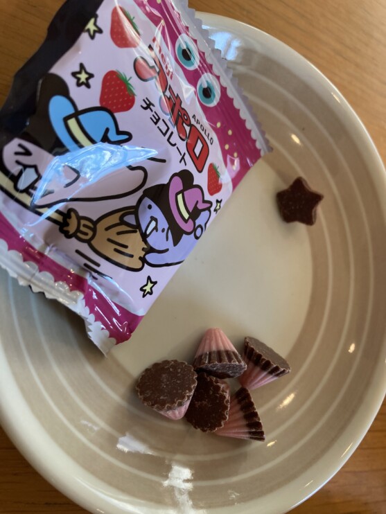 A君が学校から帰って来て、おやつとして「アポロ」を食べていました。