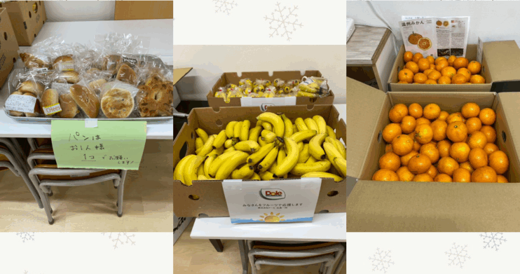 大人気のバナナは、株式会社Dole様、味が濃くて甘いみかんは、Convergint合同株式会社様、たくさんの種類のパンは、目黒区のかみよん工房様からいただきました。